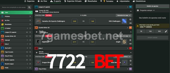 O 7722 Bet oferece uma grande seleção de opções de apostas em e-sports com probabilidades competitivas